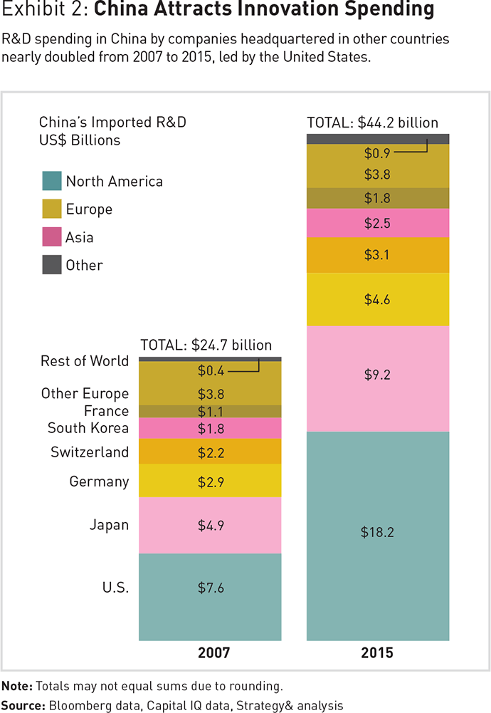 Between 2007 and 2015, corporate R&D spending in China increased by 120 percent to $55 billion.