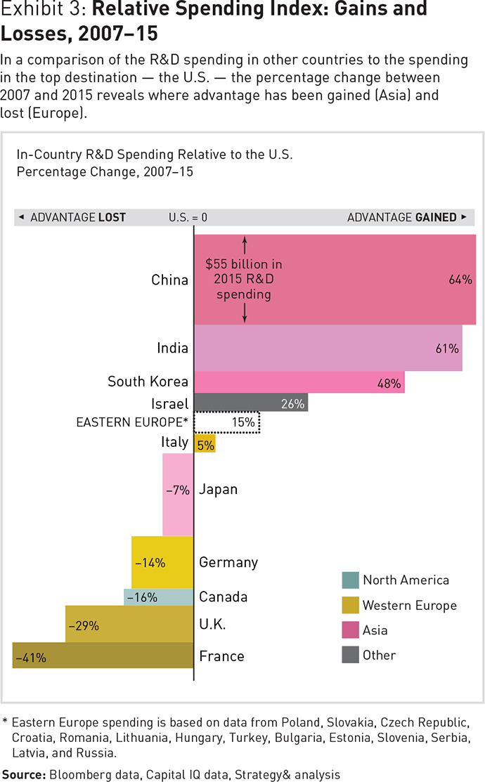 The U.S. held its position as the number one location for innovation, with total in-country R&D spending of $145 billion in 2015, despite the fact that U.S.-headquartered companies exported $121 billion in R&D in the same year. Much of this exported R&D went to lower-cost countries, particularly in Asia. India and China led as destinations for U.S. exports, each with 15 percent of the total. This represents a significant change since 2007, when the U.K. was the top destination for U.S. R&D exports. France was also among the top 10 destinations for U.S. exports in 2007, but has since been surpassed by South Korea. A helpful way to visualize how relative advantage has changed between countries from 2007 to 2015 is to look at the change in each country’s total in-country R&D spending compared with that of the United States, which remains the largest location for R&D (see Exhibit 3).