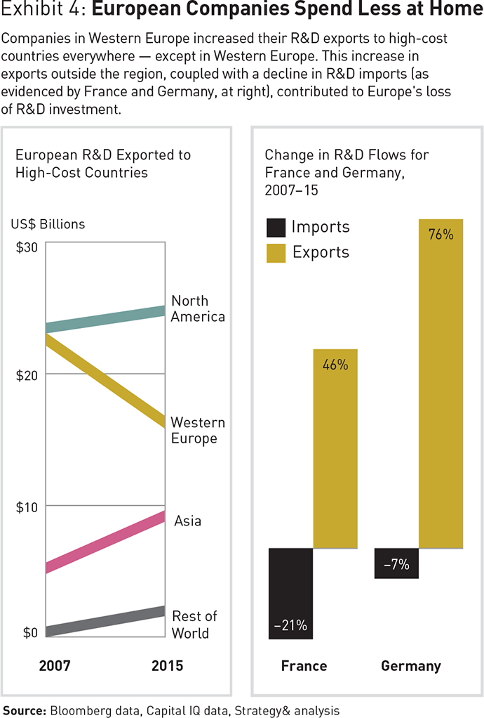 Germany — Europe’s biggest economy — is a case in point: In-country R&D spending rose a modest 15 percent between 2007 and 2015. German companies’ R&D exports totaled $35 billion in 2015, which more than doubled their domestic spending. Meanwhile, Germany’s overall R&D imports fell. France’s R&D performance was similar, but even weaker. Total in-country R&D spending in France fell by 21 percent between 2007 and 2015, as French companies’ exports of R&D rose 46 percent and total French imports fell by 21 percent (see Exhibit 4). The largest destinations for French R&D exports were the U.S. (28 percent), China (13 percent), Germany (8 percent), and India (7 percent).