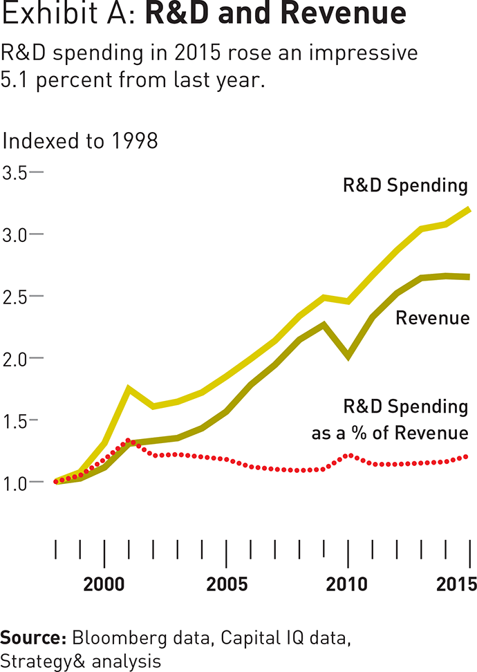 Revenues for the Global Innovation 1000 would have increased as well, had it not been for the effects of collapsing oil prices on top-line growth in energy firms, which edged overall revenue down by 1 percent. This phenomenon also contributed to a slight rise in R&D intensity, or inno-vation spending as a percentage of revenue, from 3.5 percent in 2014 to 3.7 percent in 2015. Companies tend to stick with their innovation programs despite cyclical revenue fluctuations: R&D spending growth has often outpaced revenue growth for the Global Innovation 1000 (see Exhibit A).