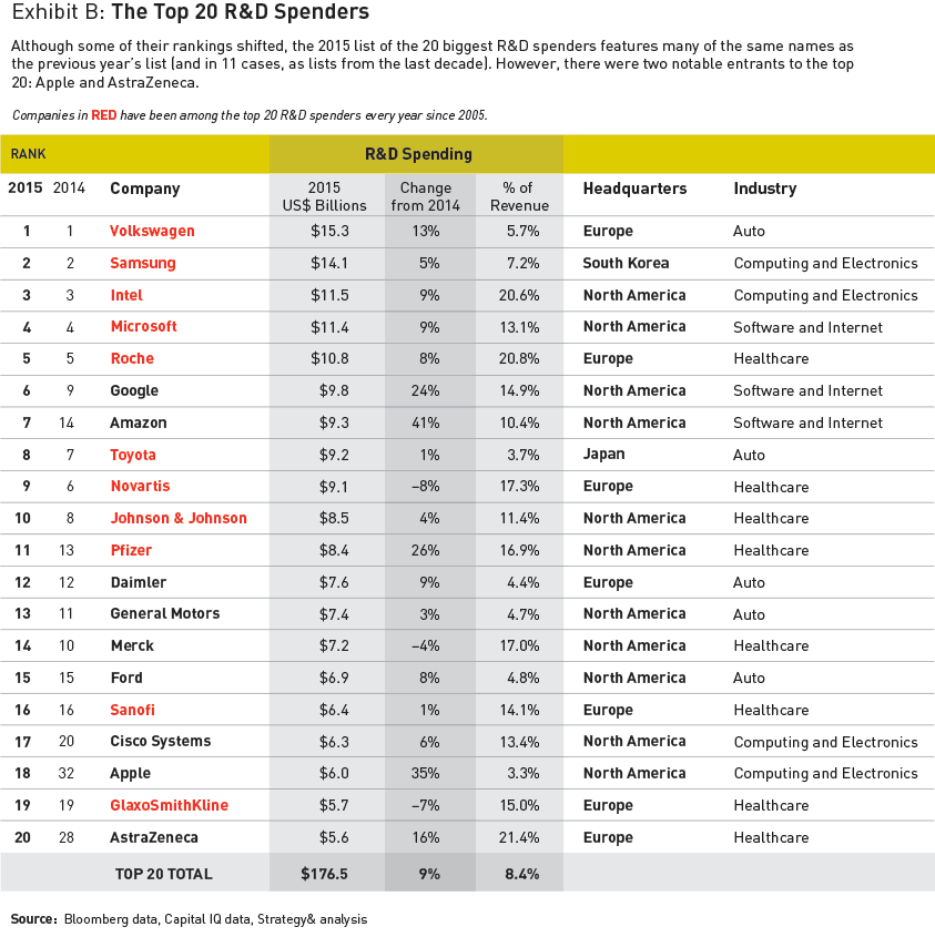 Volkswagen, Samsung, Intel, Microsoft, and Roche led the Global Innovation 1000 in R&D spending, and held the top five positions for the second year in a row. Apple joined the top 20 list at number 18, powered by its sustained growth. AstraZeneca was the other newcomer to the list, at number 20 (see Exhibit B). This is the first time Apple has appeared on the top 20 spenders list. Still, the company is an efficient and effective innovator: It has the lowest R&D intensity of any company on the top 20 list, spending only 3.3 percent of its revenues on R&D, compared with an average of 12.5 percent for the other 19 companies on the list. In addition, Apple’s R&D intensity is less than one-third the 11.8 percent average intensity of its competitors in the computing and electronics industry.