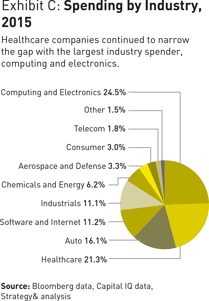 Among industries, the computing and electronics, healthcare, and auto sectors continued to spend the most on R&D. In total, they accounted for 62 percent of total Global Innovation 1000 R&D spending (see Exhibit C). However, R&D spending by computing and electronics companies fell 0.7 percent in 2015, whereas R&D spending by healthcare companies rose 6.0 percent (see Exhibit D). The healthcare sector is closing in on the number one position; if the current trend continues, the industry will be the largest R&D spender by 2019.