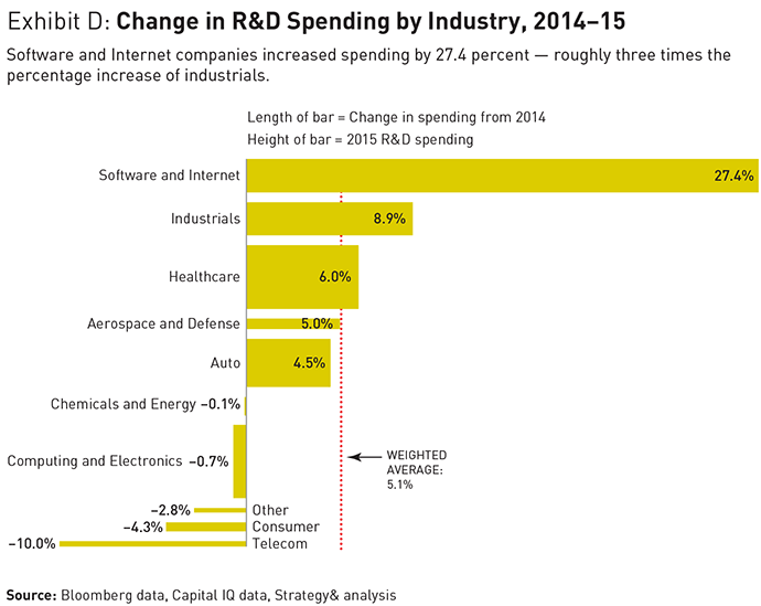 But the biggest movers among industries have been software and Internet companies. The industry increased R&D spending by 27.4 percent between 2014 and 2015. Software and Internet also had the largest average growth of any industry over the last 10 years — 13.2 percent — and passed industrials in 2015 to become the fourth-largest industry in terms of R&D spending. This rank change happened despite the fact that industrials companies posted the second-largest year-over-year increase, at 8.9 percent, and the third-highest 10-year average increase, at 6.3 percent.