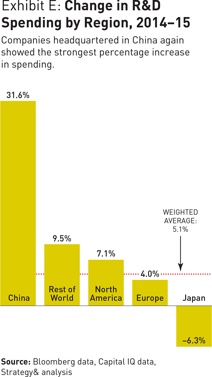 Companies headquartered in these countries now represent 227 of the Global Innovation 1000, compared with 64 companies 10 years ago. Companies based in China, in particular, increased their spending by 31.6 percent in 2015 (see Exhibit E). And over the last decade, Chinese companies increased their R&D spending by more than 3,000 percent. Moreover, as we’ve noted, measuring innovation spending by where companies are headquartered as opposed to where the innovation work is actually done significantly understates the major shift of innovation activity to Asia.