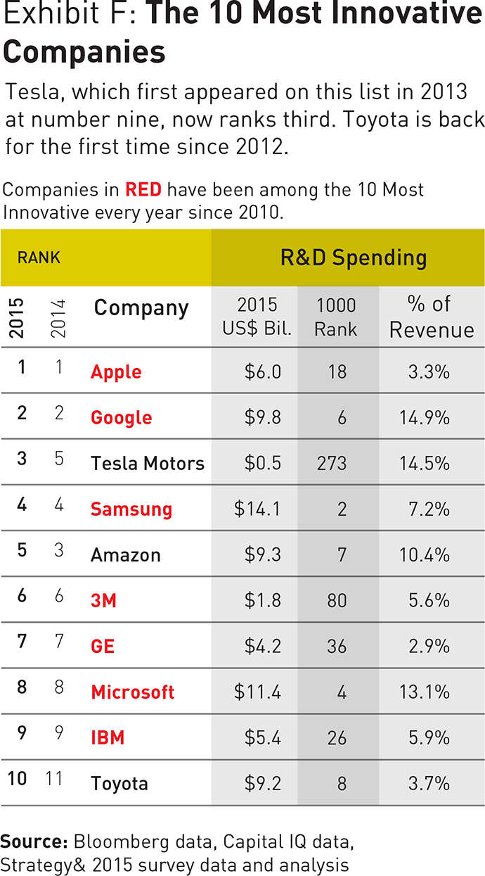 Apple and Google still rule as the world’s most innovative companies, according to our 2015 Global Innovation 1000 survey (see Exhibit F). This one–two showing has been consistent since we began asking participants to identify the top innovators six years ago. Apple continues to set new production records for iPhones and computers, and burst into an entirely new market with the debut of the Apple Watch. Meanwhile, Google’s paradigm-changing self-driving car project continues to generate buzz, as do its experiments with solar-powered drones for providing Internet services in remote areas. In August 2015, the company introduced its Alphabet holding company structure to better facilitate focus and innovation across its growing portfolio.