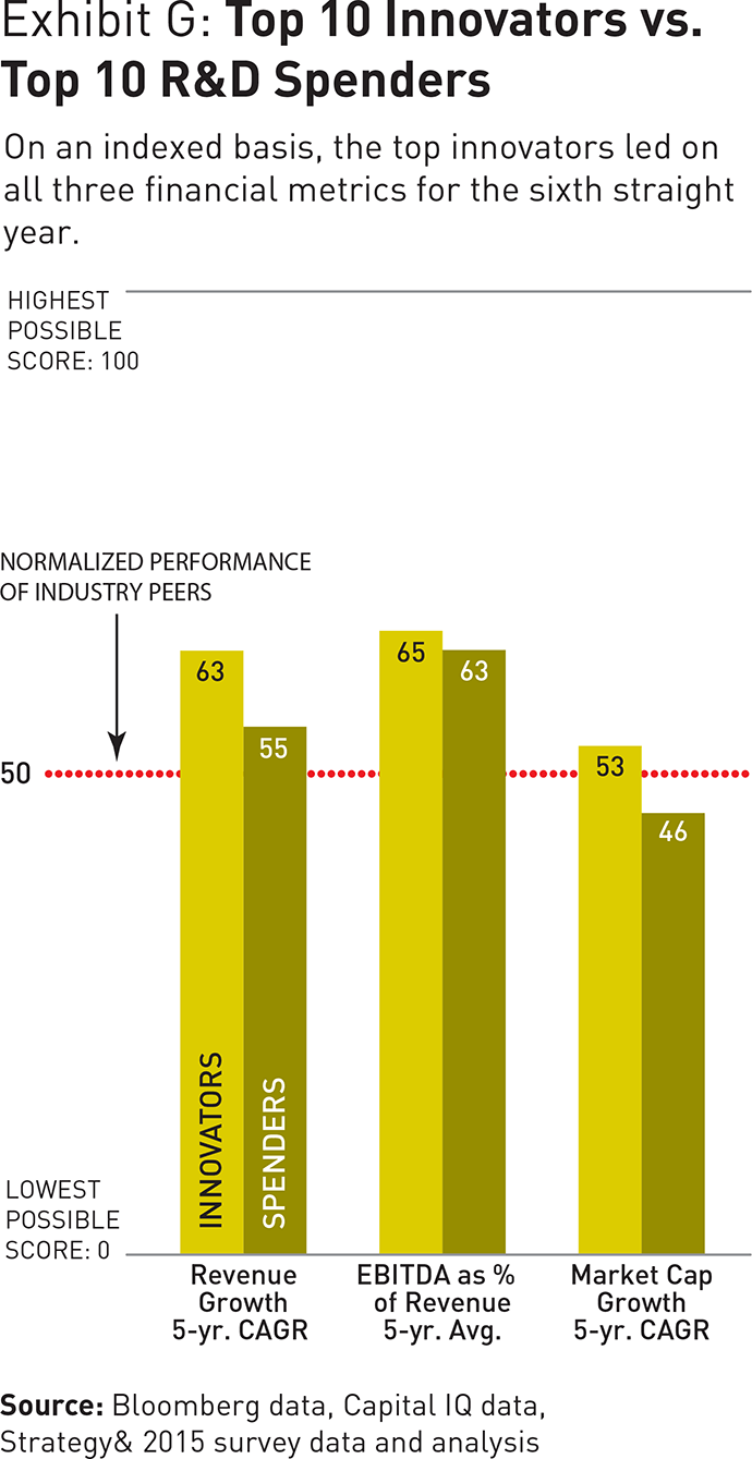 As in all previous years, the 10 most innovative companies outperformed the 10 biggest R&D spenders on revenue growth, EBITDA as a percentage of revenue, and market-cap growth (after normalizing for industry variations) (see Exhibit G).