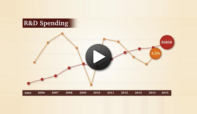 The companies in the Global Innovation 1000 spent US$680 billion on R&D in 2015. That represented a 5.1 percent increase from 2014, a year in which R&D spending grew a meager 1.4 percent. The 2015 spending growth marked the largest year-over-year increase since 2011 and 2012, when we reported above-average catch-up gains after the Great Recession. It also indicated a reversion to the long-term trend of R&D spending growth of 5.4 percent demonstrated over the last 10 years.