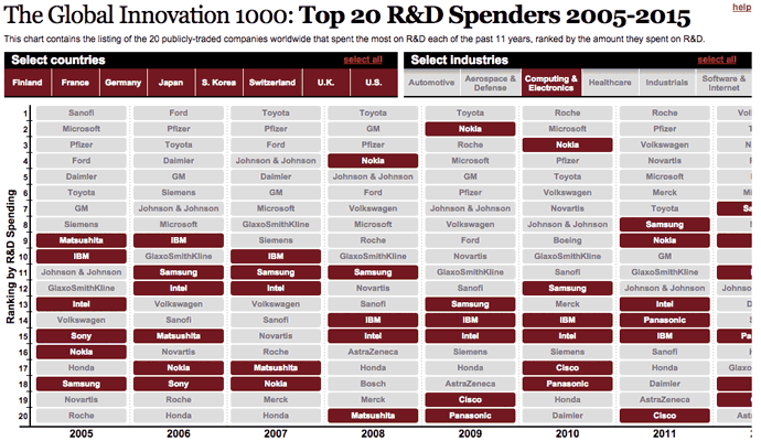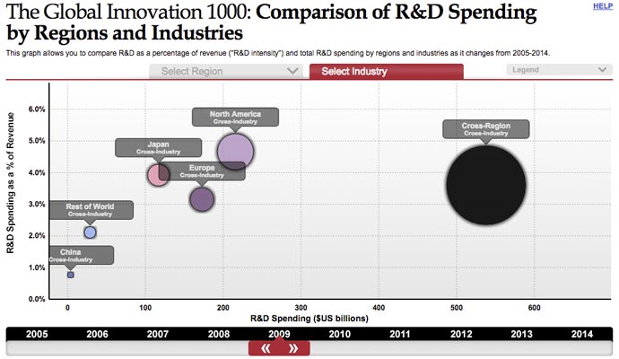 Still, this type of analysis provides an accurate gauge of where innovation activity is being conducted around the world, and how corporate management makes R&D investment decisions. It also provides a way to chart the relative gains and losses across countries and regions.